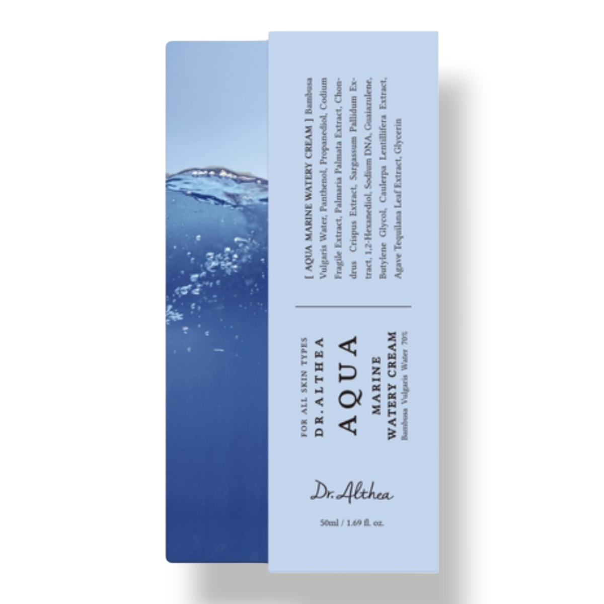 Dr. Althea Aqua Marine Watery Cream to lekki, wegański krem do twarzy o delikatnej -wodnistej konsystencji, który intensywnie nawilża, koi podrażnienia i wspiera regenerację skóry, idealny do codziennego stosowania dla każdego typu cery.