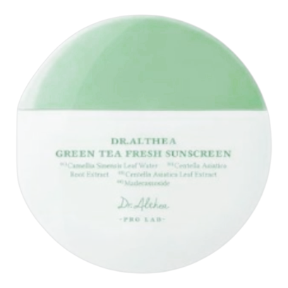 Dr. Althea Green Tea Fresh Sunscreen SPF50+ PA++++ – lekki, łagodzący krem przeciwsłoneczny do skóry wrażliwej, tłustej i trądzikowej. Chroni przed promieniowaniem UVA/UVB, koi podrażnienia, nawilża i wspomaga regenerację skóry, pozostawiając cerę gładką, promienną i komfortową przez cały dzień. Idealny solo lub pod makijaż.