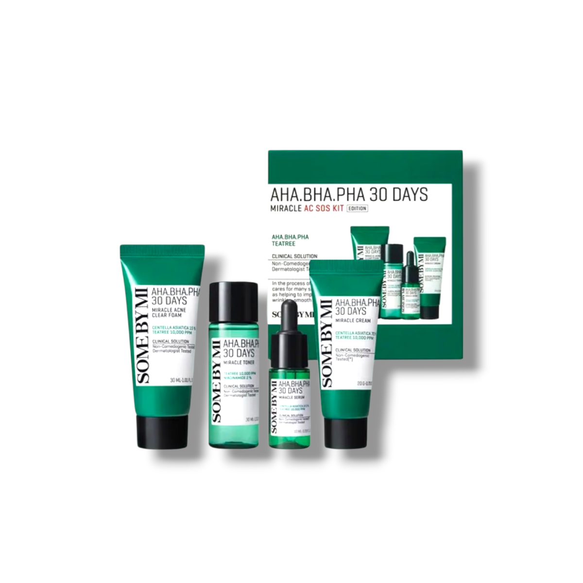 Some By Mi – AHA BHA PHA 30 Days Miracle AC SOS Kit to 4-etapowy zestaw z kwasami AHA, BHA i PHA do pielęgnacji skóry tłustej, mieszanej i problematycznej. Oczyszcza, delikatnie złuszcza, reguluje sebum i wspiera redukcję przebarwień. Idealny jako 30-dniowa kuracja normalizująca.