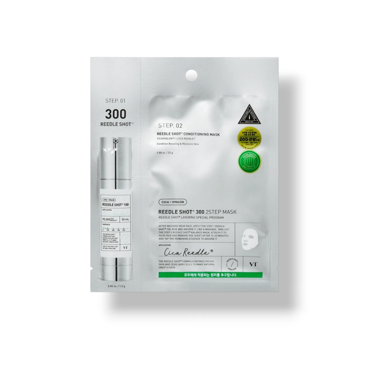 VT Cosmetics Reedle Shot 300 2Step Mask to dwuetapowa maska ujędrniająca w płachcie. Zestaw łączy booster oraz maskę z innowacyjnym kompleksem Cica Reedle™, który stymuluje odnowę skóry i zwiększa wchłanialność składników aktywnych. Niacynamid, adenozyna, ceramid NP i ekstrakt z propolisu wspierają nawilżenie, elastyczność i wygładzenie skóry oraz poprawę jej kolorytu.